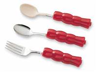 Child-size utensils are weighted to stabilize the hand Bright red plastic vinyl handles are shaped to fit fingers. Handles 7/8" diameter, 3¼" long. Wt. approx. 4 oz. Stainless steel. Dishwasher safe to 180°F. Latex free.