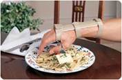 Leather- covered metal splints. Hand cuff is leather with Velcro® closure, and the pocket angle is permanently fixed. MCP width measurements below. Fork not included. Latex free.